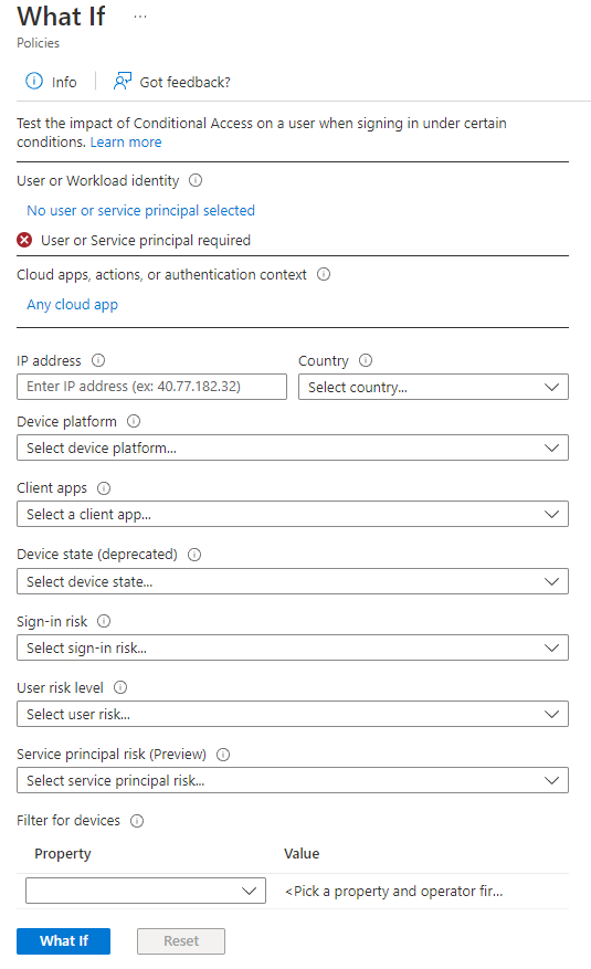 https://learn.microsoft.com/en-us/azure/active-directory/conditional-access/what-if-tool